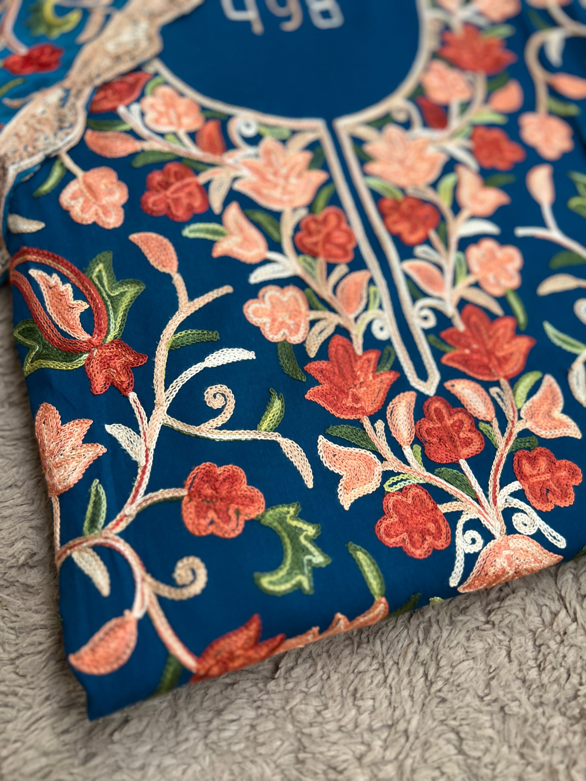 Step into timeless elegance with this teal blue modal cotton suit, richly detailed with full jaal Kashmiri embroidery. The bottom comes attached with the top for easy stitching and added convenience. Paired with a fully Kashmiri embroidered chiffon dupatta, this outfit blends luxury with comfort—perfect for festive gatherings, functions, or elegant everyday wear.