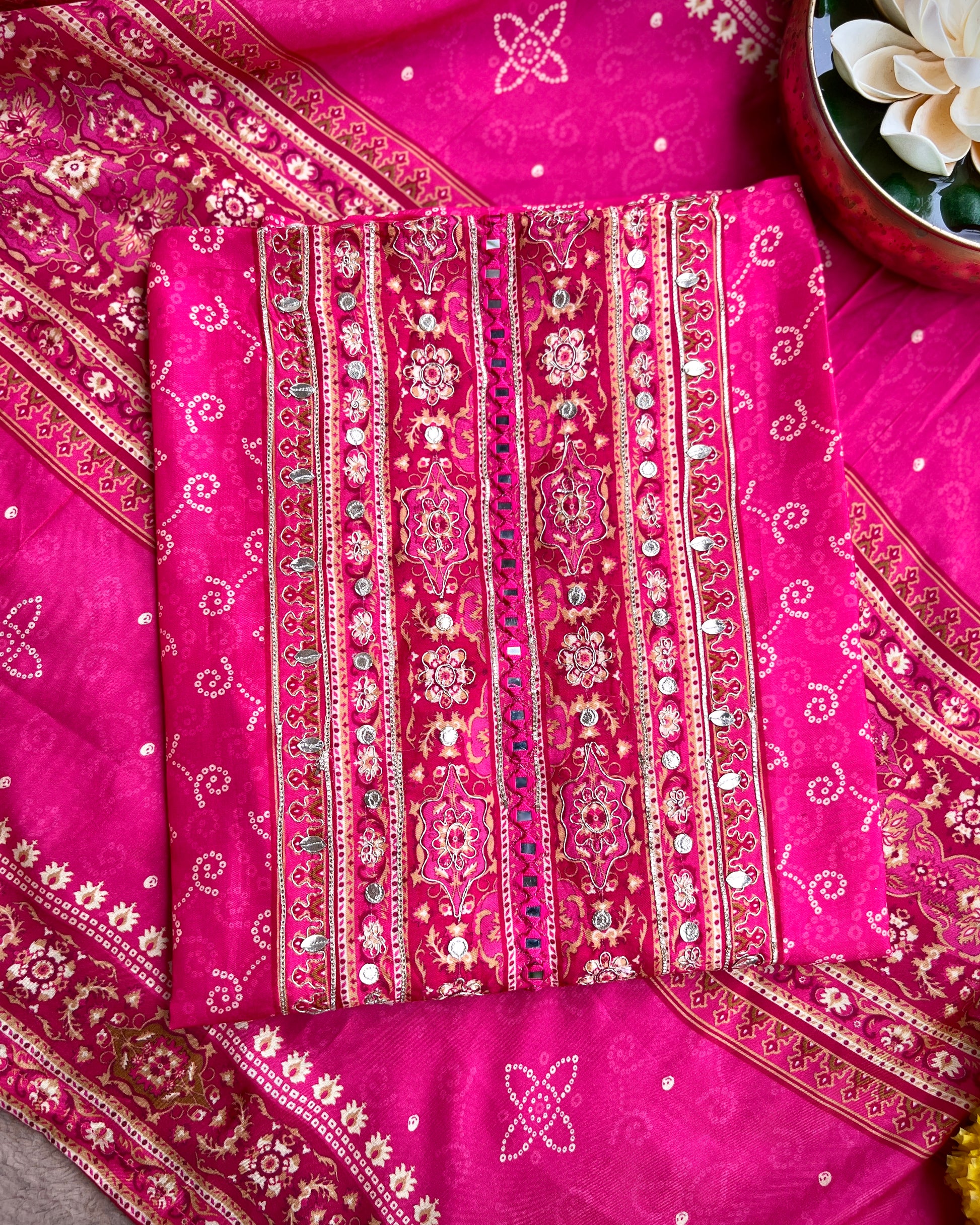A luxurious Fuchsia Pink ensemble in premium Russian silk with timeless bandhni print. The neckline is adorned with exquisite hand embroidery, complemented by a rich silk dupatta and a soft Shantoon bottom. A true blend of elegance and tradition.
