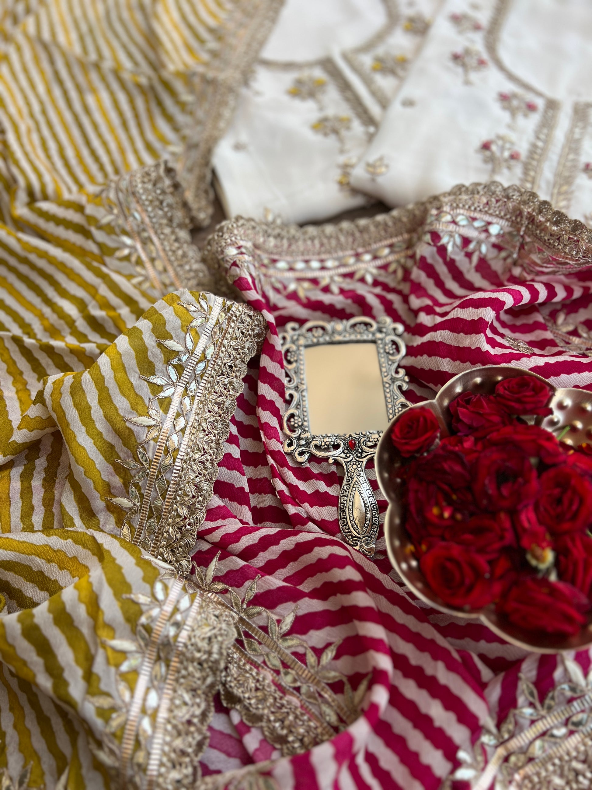 A timeless creation crafted in soft butter crepe with a soothing vanilla base, adorned with intricate handwork for a touch of luxury. The highlight of this ensemble is its stunning Laheriya chinnon dupatta, beautifully finished with delicate four-side gota work. Designed with versatility in mind, the set comes with two dupatta options – vibrant Raani Pink for festive grandeur, and graceful Mehndi Green for subtle sophistication.