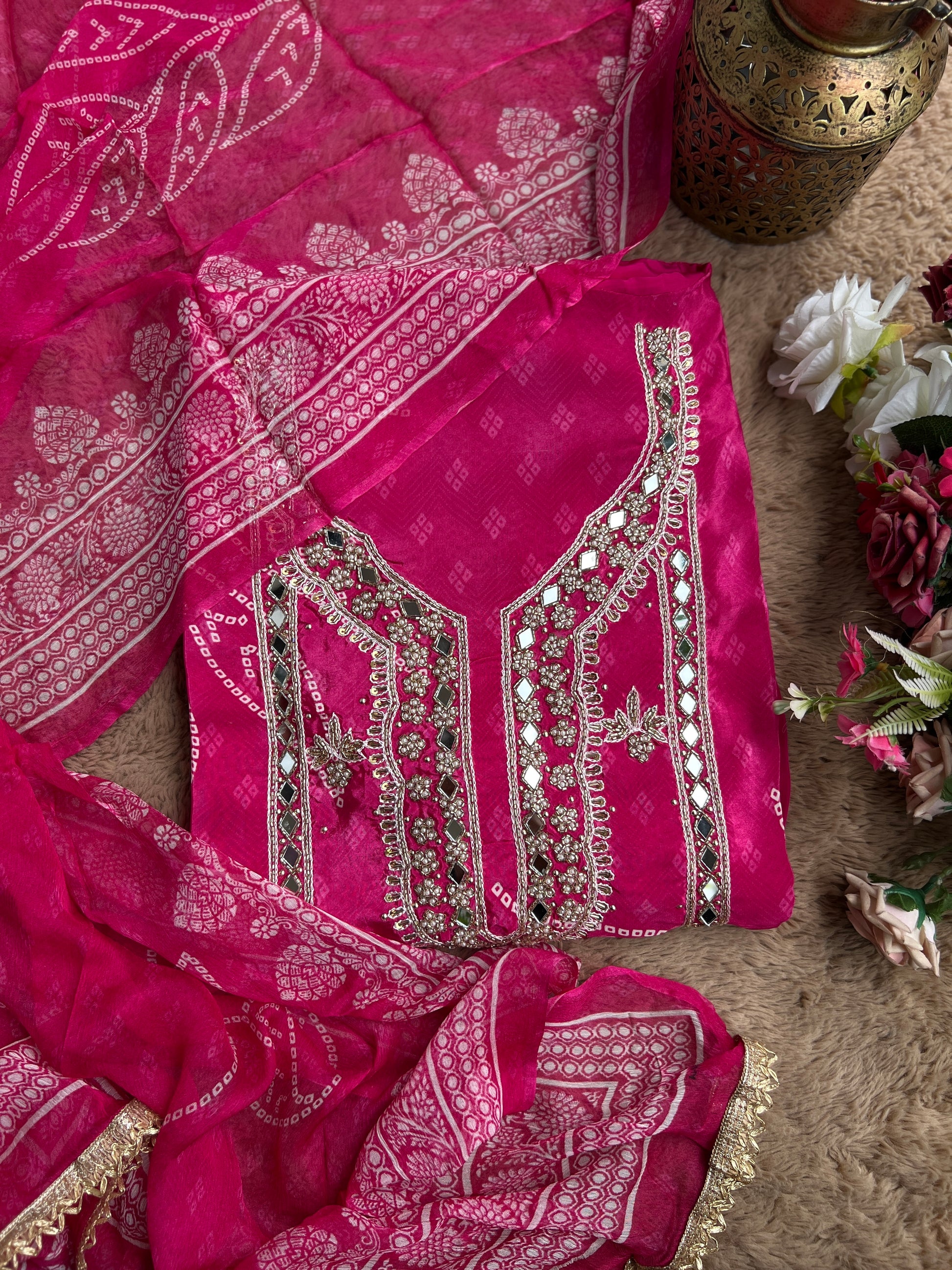 This stylish outfit is a beautiful representation of traditional craftsmanship, featuring a crepe top intricately adorned with the timeless bandhej print, known for its vibrant tie-dye patterns that add a burst of color and cultural richness. The top is paired with a comfortable Shantoon bottom, expertly crafted to ensure a perfect fit and effortless wear, making it suitable for both casual and festive occasions. The ensemble is gracefully completed with a lightweight chiffon dupatta, which mirrors the bandhej design of the top, enhancing the overall aesthetic with its delicate texture and flowing movement. Together, these elements create a harmonious blend of tradition and elegance, offering a versatile and eye-catching salwar suit that celebrates heritage while catering to modern fashion sensibilities.